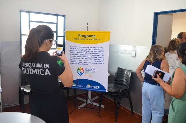 Pibidianos, no interior do Centro, em frente ao poster do Programa Interinstitucional "Experiências Compartilhadas"