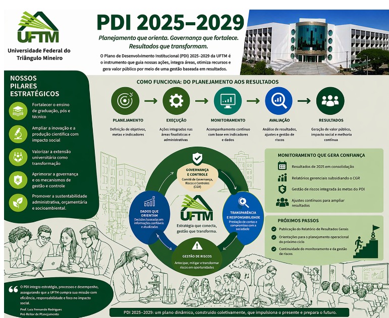 Publicado em março de 2025, o Plano de Desenvolvimento Institucional da Universidade Federal do Triângulo Mineiro (UFTM), PDI 2025–2029, constitui o principal instrumento de planejamento estratégico da Instituição. O documento estabelece, de forma estruturada, diretrizes, prioridades, metas e indicadores que orientam a atuação institucional, promove a integração entre as atividades acadêmicas e administrativas ao consolidar uma gestão orientada por resultados com metodologia própria.