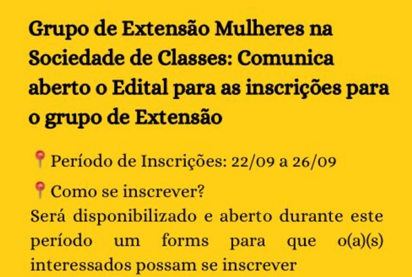 Estão abertas as inscrições para o processo seletivo do grupo de extensão "Mulheres na sociedade de classe: gênero, raça, desigualdade e violência", uma iniciativa dedicada a...