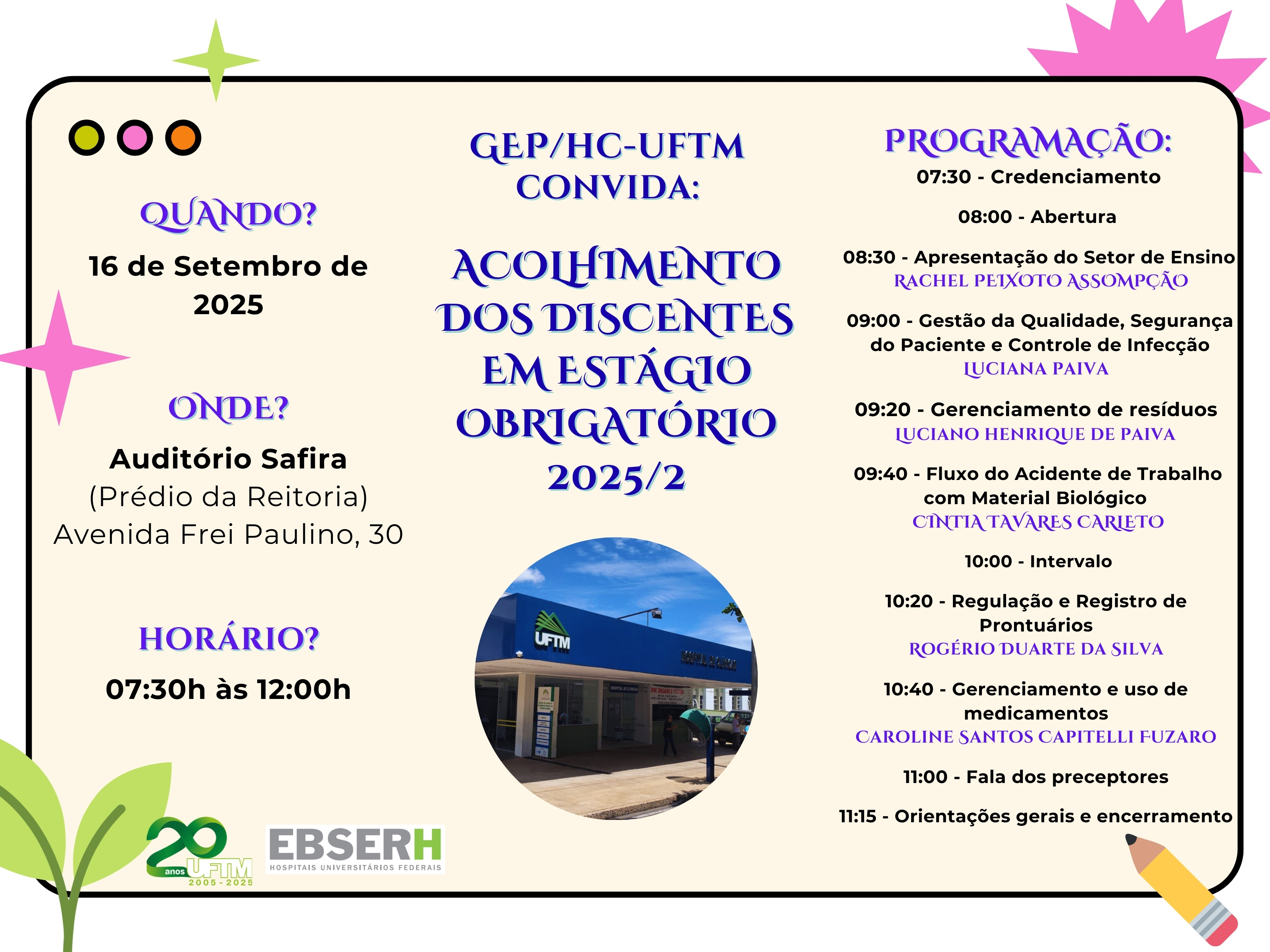 A Gestão de Ensino e Pesquisa do Hospital de Clínicas da UFTM convida para o Acolhimento dos Discentes em Estágio Obrigatório 2025/2, momento essencial para...