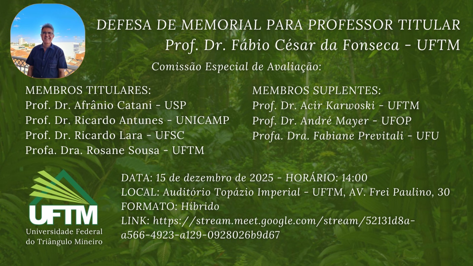 O Departamento de Filosofia e Ciências (DFICS), do Instituto de Educação, Letras, Artes, Ciências Humanas e Sociais (IELACHS) da Universidade Federal do Triângulo Mineiro (UFTM), convida a comunidade acadêmica e demais interessados para a defesa pública do Memorial Acadêmico do Professor , etapa integrante do processo de promoção à Classe D – Professor Titular.