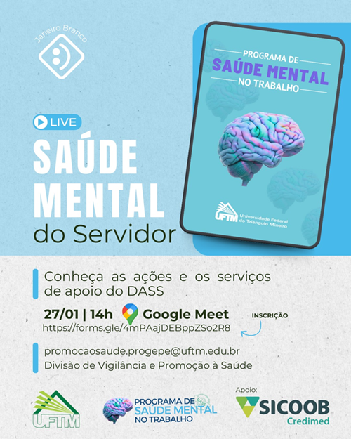 Em alusão à campanha Janeiro Branco, que destaca a importância do cuidado com a mente e as emoções, o Departamento de Atenção à Saúde do Servidor (DASS) da UFTM realiza, no final deste mês, o encontro online: “Saúde mental do servidor em foco: conheça as ações e os serviços de apoio do DASS”.