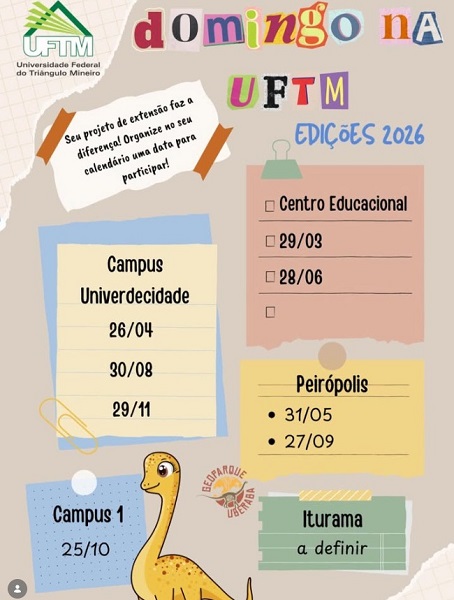 A Pró-reitoria de Extensão, Cultura e Esporte (PROEXT) da UFTM divulgou novas datas e locais para a realização do Domingo na UFTM no ano de 2026.