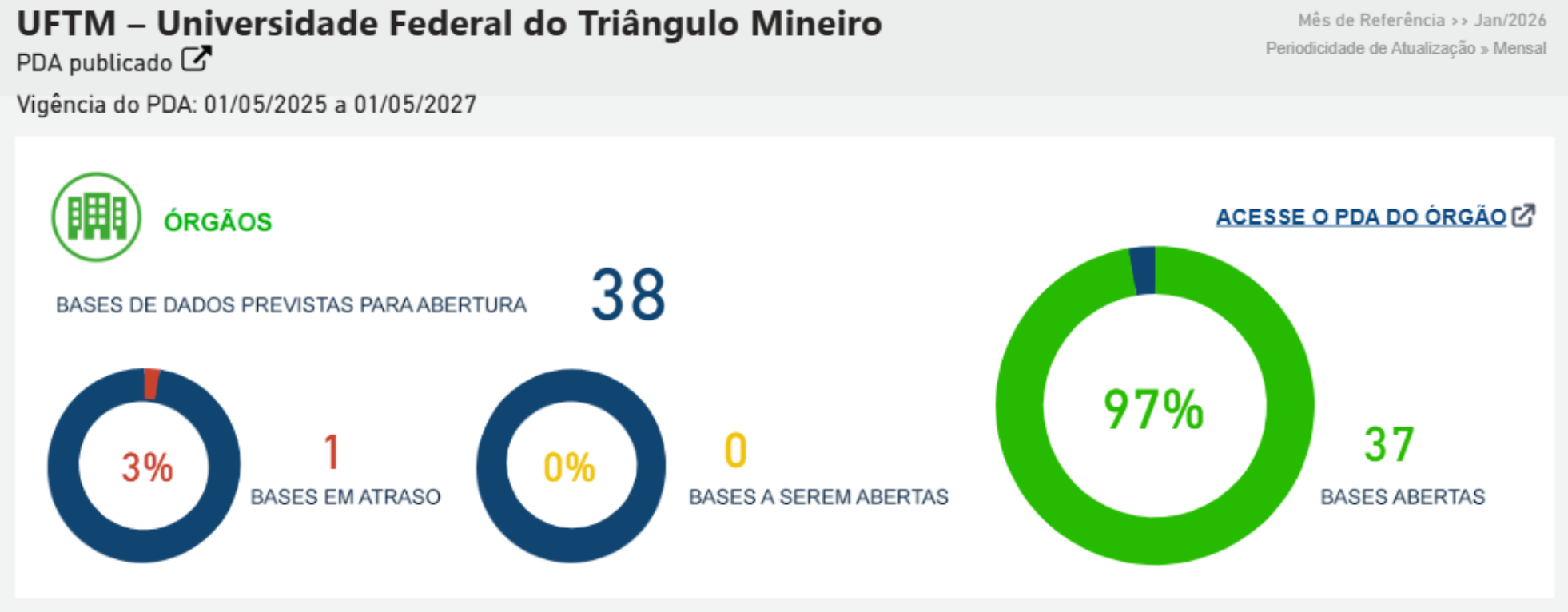 No âmbito do 4º Plano de Dados Abertos (vigência 2025–2027), a UFTM manteve o compromisso com a abertura e atualização contínua de bases de dados de interesse público.