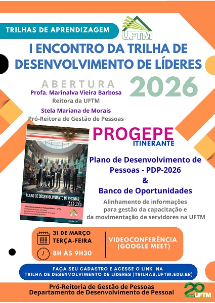 O Setor de Capacitação de Pessoal da UFTM dará início à série de “Encontros da Trilha de Desenvolvimento de Líderes de 2026”. O I Encontro (abertura) está programado para o dia 31 de março de 2026, terça-feira. Serão apresentaremos o Plano de Desenvolvimento de Pessoas (PDP-2026) e haverá diálogo sobre os principais procedimentos para Capacitação de Pessoal, bem como sobre algumas funcionalidades do Banco de Oportunidades para movimentação de pessoal no âmbito da UFTM.